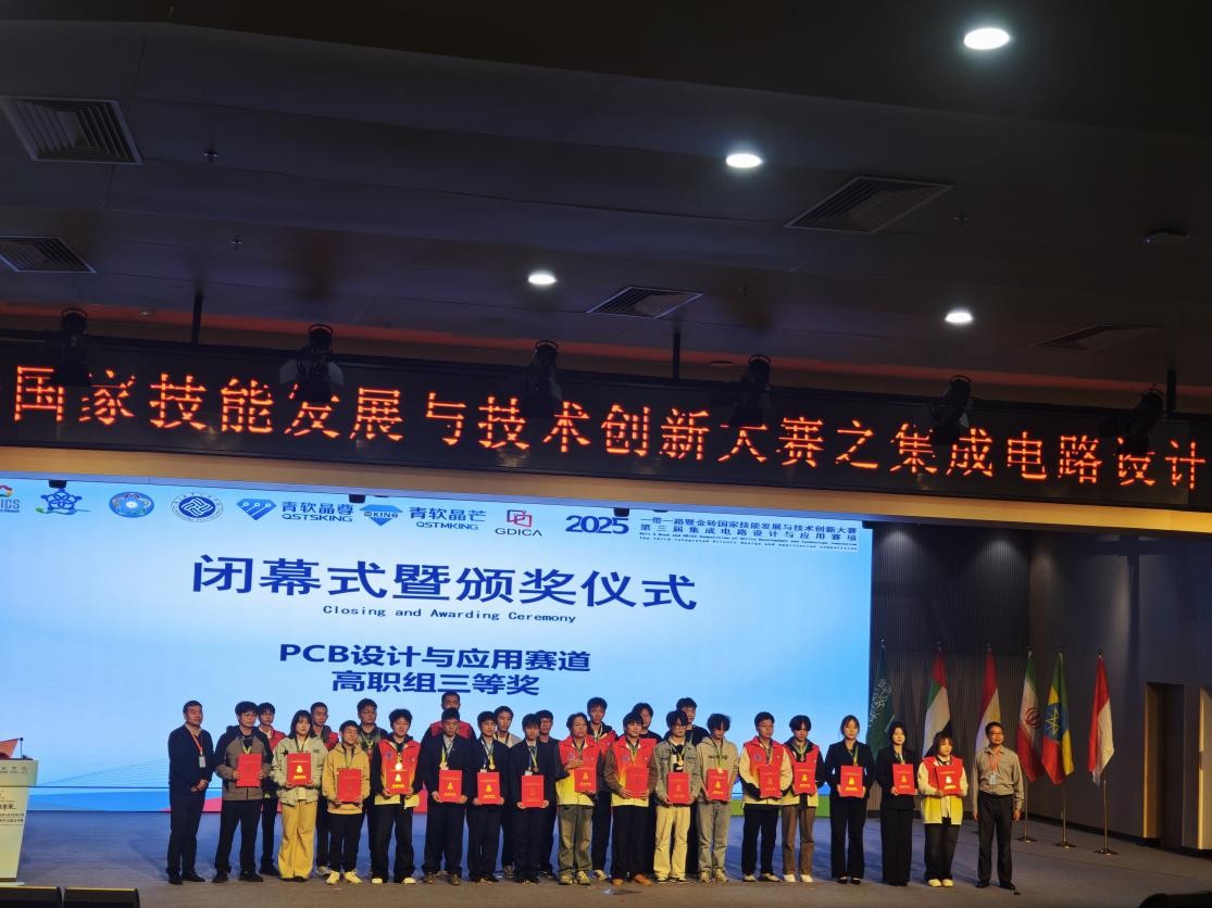 2025年11月28日至30日,2025“一带一路”暨金砖国家技能发展与技术创新大赛集成电路设计与应用赛项全国总决赛在广东职业技术学院圆满收官。来自全国70余所高校选手同台竞技,经过三日激烈角逐,电子与物联网工程学院肖兰秋同学和陈禹菘同学表现亮眼,分别斩获IC赛道全国二等奖和PCB赛道全国三等奖。