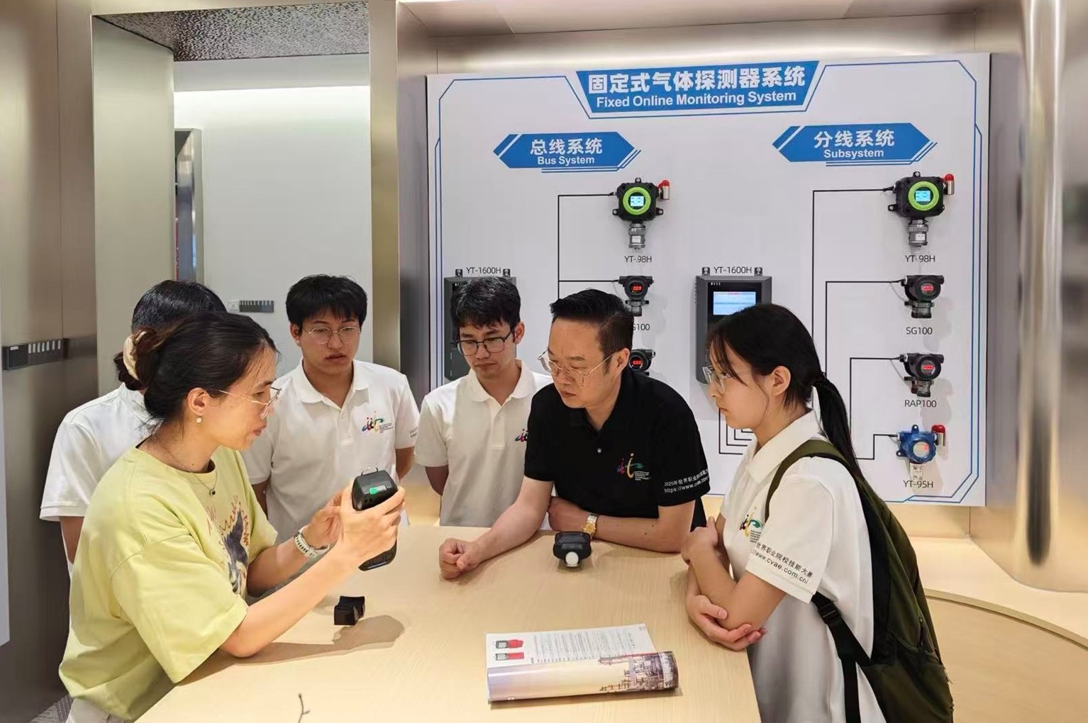 在元特科技产品展厅,师生一行系统了解了企业在气体检测仪器仪表领域的产品布局与技术特点,近距离观摩了多款气体检测类新品的结构设计与功能演示,详细询问了产品在工业安全监测等场景中的典型应用案例。通过现场讲解与互动交流,同学们对气体检测行业的发展趋势及前沿技术有了更加直观、立体的认识。