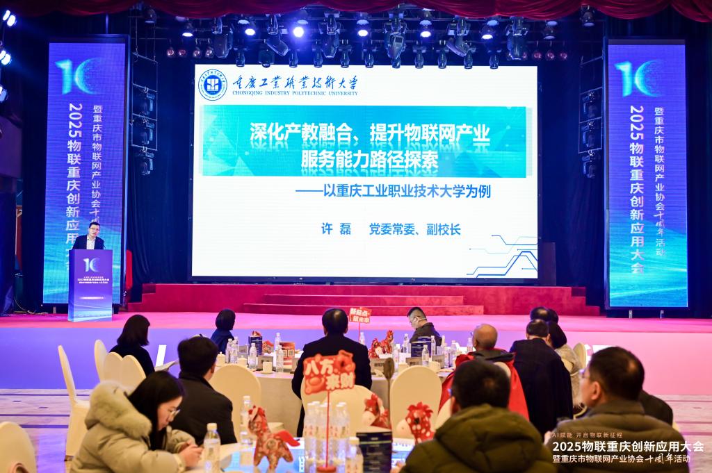 1月16日,2025物联重庆创新应用大会暨重庆市物联网产业协会十周年总结活动在重庆举行。重庆工业职业技术大学受邀参会,并作为新增理事单位代表在会上作交流发言。